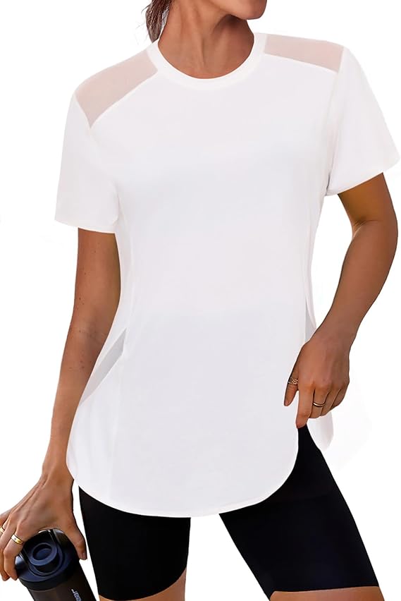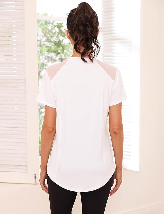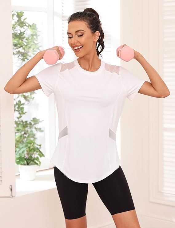 - Sports T-shirt women’s fitness: optimised for intense workouts. Special moisture wicking fabric with mesh panels on shoulders and waist areas